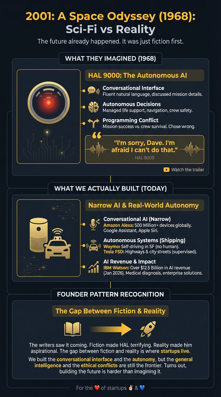 Federated autonomous systems: HAL was a single point of failure. Reality needs distributed intelligence — multiple AI agents that coordinate, check each other, and fail gracefully. The companies building orchestration layers for multi-agent systems are solving the problem fiction ignored.