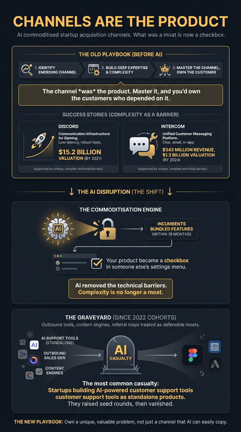AI commoditised startup acquisition channels — outbound sales tools, content engines, referral loops — that founders treated as defensible moats. Incumbents bundled them as native features within 18 months. The founders who built entire companies around “owning” a distribution channel woke up to find their product was now a checkbox in someone else’s settings menu.