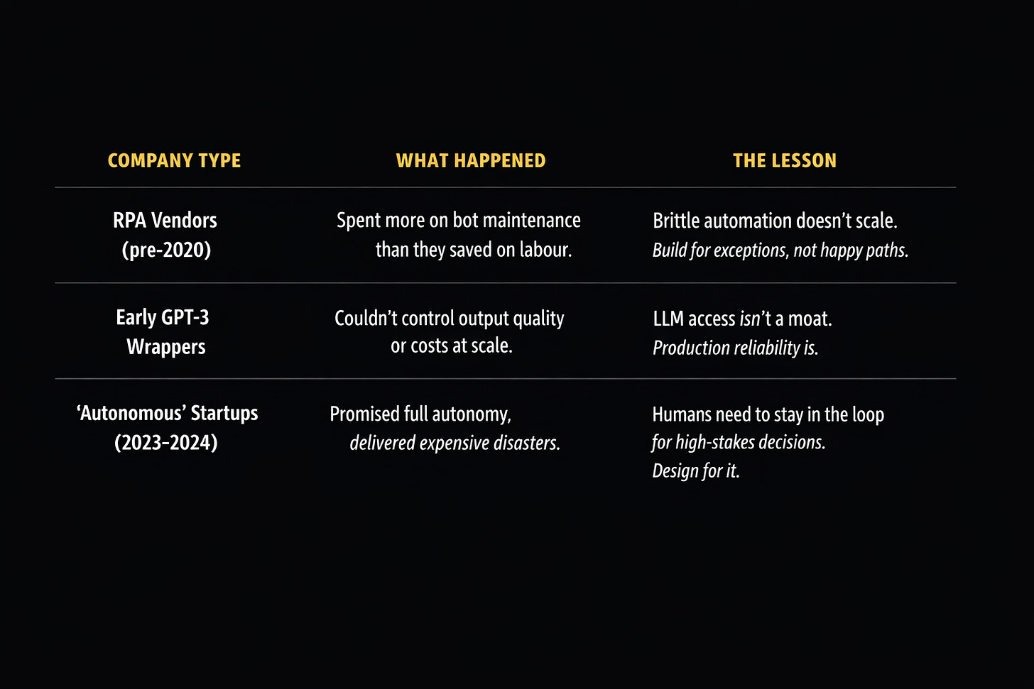 Businesses have always paid humans to do repetitive work that computers should handle. The problem wasn’t recognising this — it was building systems reliable enough to trust with real operations. Early automation was brittle. Rule-based systems broke the moment reality deviated from the script. Robotic Process Automation (RPA) could click through SAP screens, but couldn’t handle exceptions. Integration platforms could move data between systems, but couldn’t decide what to do with it. The constraint was intelligence. You could automate the happy path. You couldn’t automate judgement. LLMs changed that constraint. Suddenly you had systems that could read unstructured data, make decisions based on context, and generate outputs that looked human. The question shifted from “can we automate this?” to “can we trust it?” That’s where most founders are stuck today. Building an agent that works in a demo is easy. Building one that won’t bankrupt your customer when it hallucinates is the actual product.