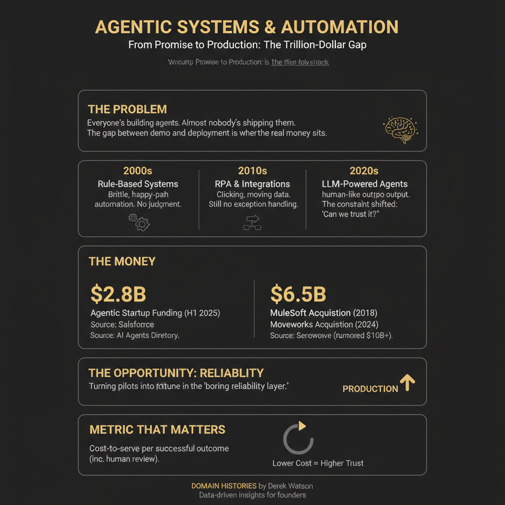 Everyone’s building agents. Almost nobody’s shipping them to production. The gap between demo and deployment is where the real money sits. $2.8B flowed into agentic startups in H1 2025 alone — but most of that capital chases wrappers. Your pitch is: we sell the boring reliability layer that turns pilots into production. We’ve been here before. Just with worse technology and different buzzwords.