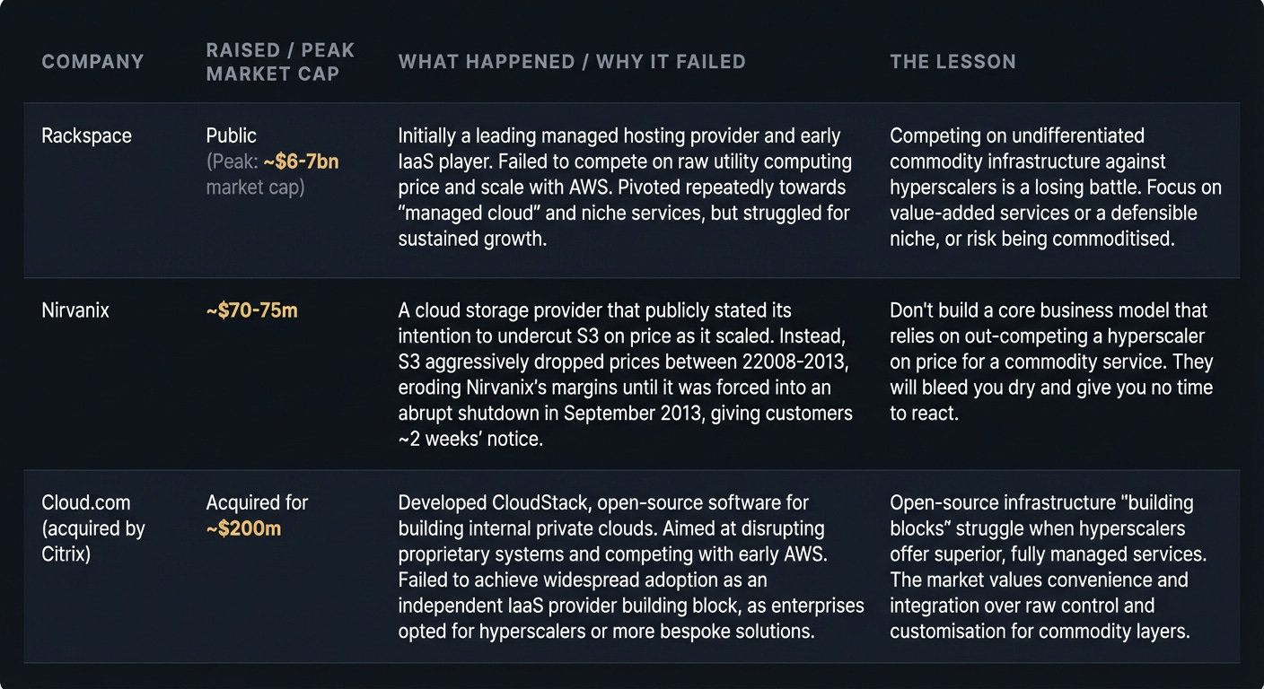 The trap: The allure of building yet another “cloud abstraction layer” for portability, like Cloud.com attempted. Every abstraction layer you build to avoid vendor lock-in is engineering effort you’re not putting into your core product. Pick your lock-in consciously, optimise it ruthlessly, and build value elsewhere.