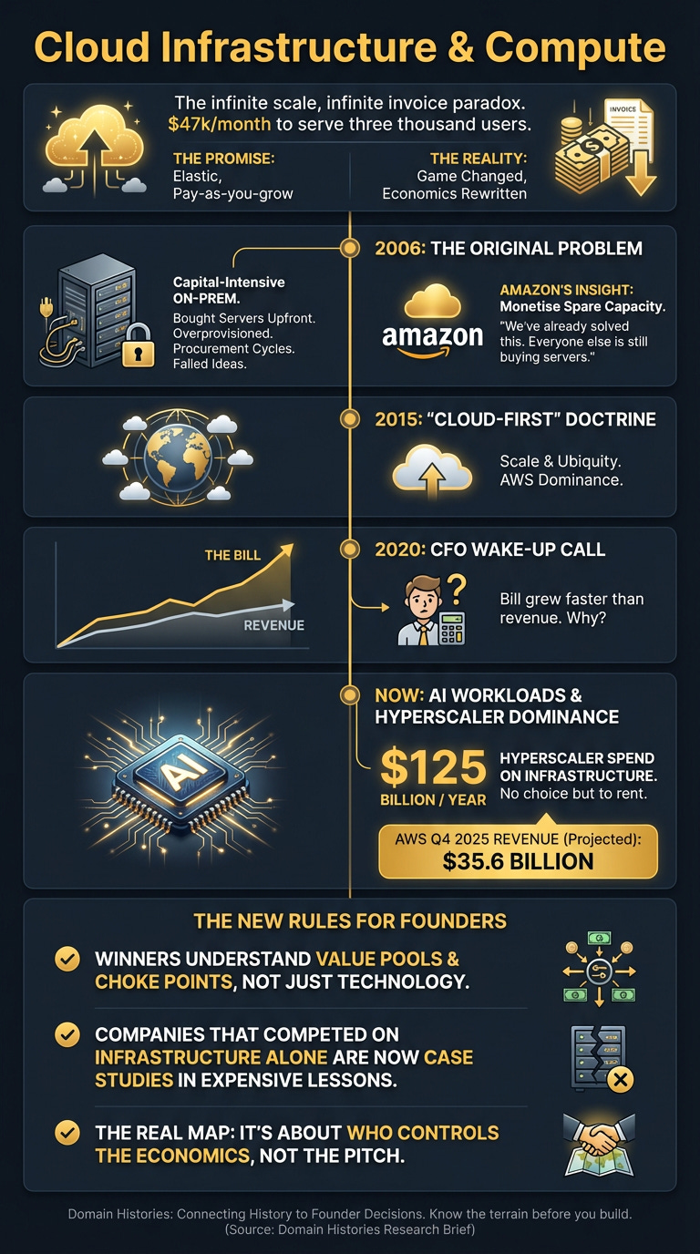 Every founder gets the pitch: elastic compute, pay-as-you-grow, infrastructure as code. Then they ship to production and discover they’re paying $47,000 a month to serve three thousand users. The cloud didn’t lie — you just didn’t know the game had changed three times since you learned the rules.