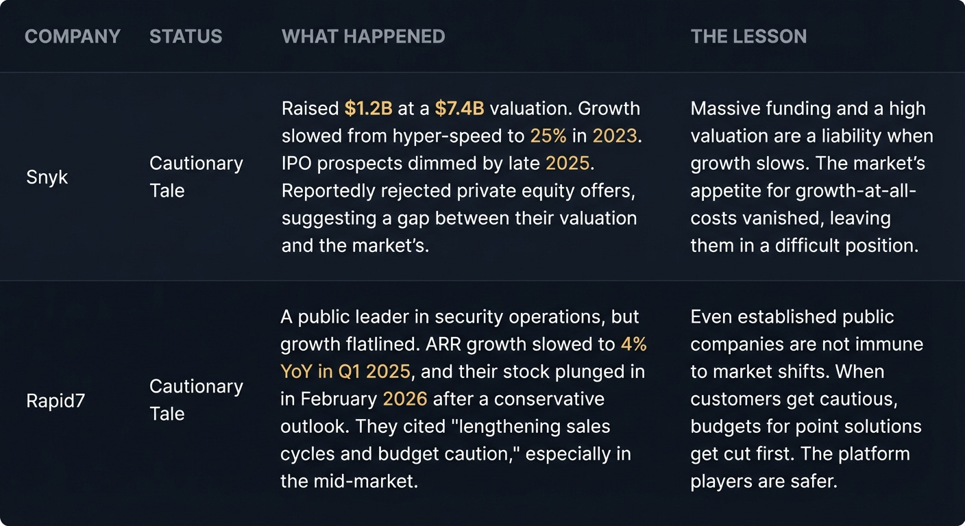 The Recalibration (Snyk/Rapid7): When the market shifts, listen. When growth slows and sales cycles lengthen, you have to change the game. Shift the focus from top-line growth to operational efficiency. It’s a tough pill to swallow, especially after raising at a huge valuation, but it’s about survival. The companies that make this pivot will live to fight another day.