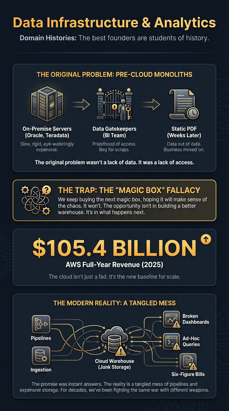 But if you understand the history — the sequence of problems and the ghosts of solutions past — you can see where the real opportunity is. It’s not in building a better warehouse. It’s in what happens next.