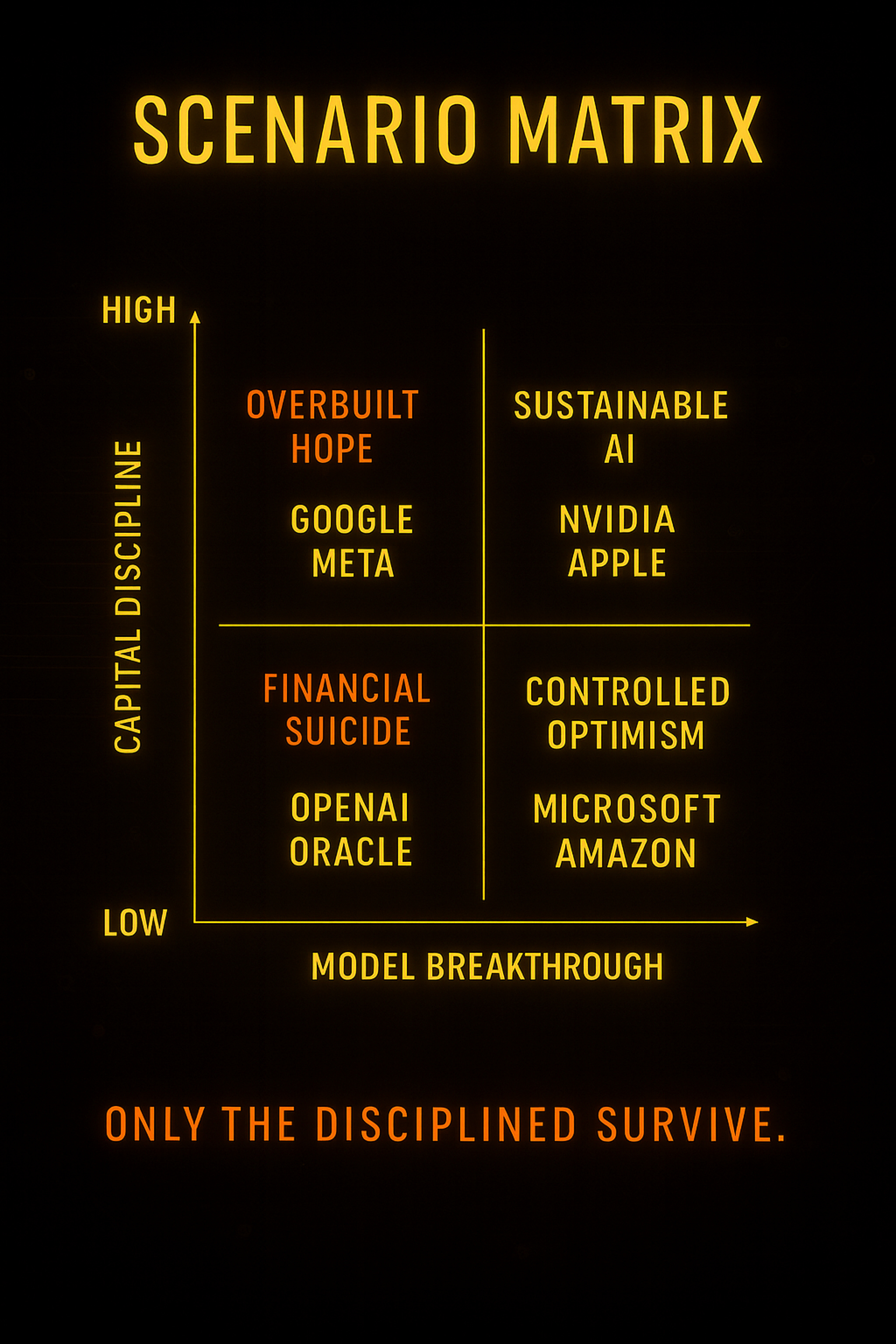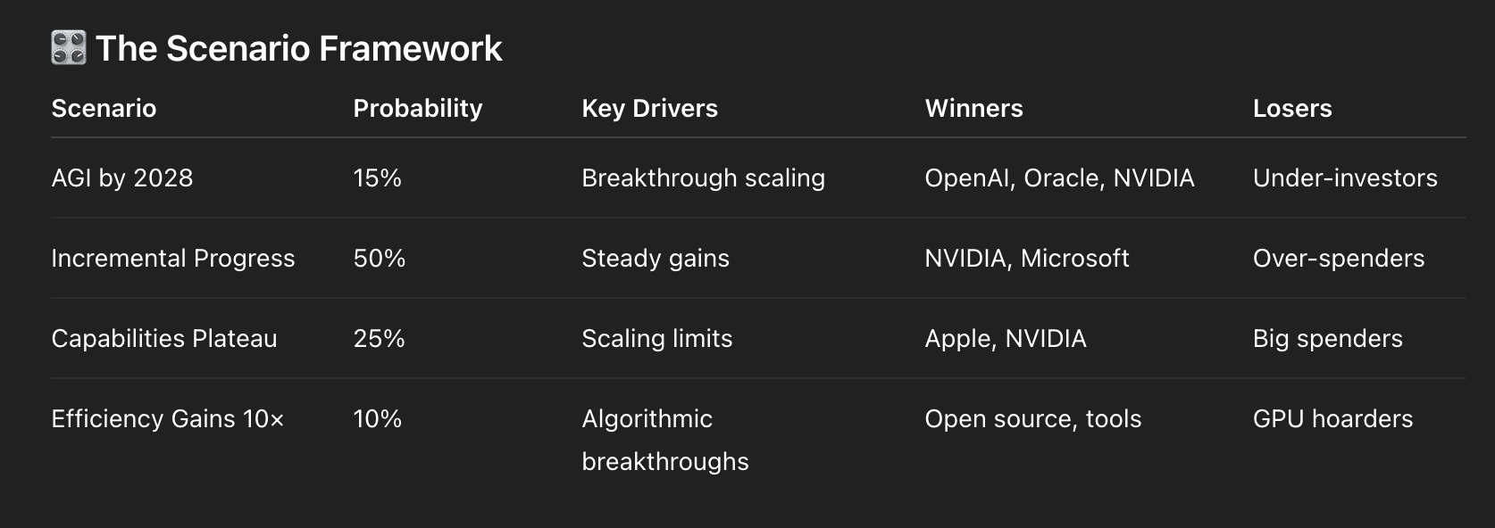 The Oracle analysis here is brutal but probably accurate. 3/10 rating and "85% chance of distres by 2029" is pretty damning. The math is stark - $15B cash flow vs $16-21B annual commitments means they're basically underwater before they even start building the infrastructure. What really stands out is the "optionality: none" assessment. Oracle is completly locked into OpenAI's success, which is a binary bet on AGI happening within 5 years. If OpenAI can't pay that $330B, Oracle is holding massive debt-financed data centers with no backup plan. The comparison to other stratgies makes it clear Oracle took the riskiest path possible.