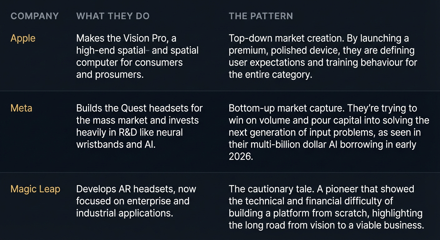 First, Apple’s entry with Vision Pro validated the space and, more importantly, started training consumer behaviour. People are finally learning the grammar of spatial interaction—the pinches, the glances, the gestures. Apple is spending billions to create the market for you.
