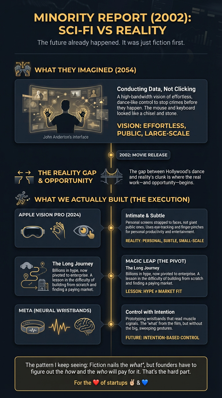 Gesture interfaces looked cool in 2002. Twenty years later, we still use mice. Here’s the thing: while Hollywood sold us a vision of effortless, dance-like control, reality delivered something much clunkier. The gap between the two is where the real work—and the real opportunity—begins.