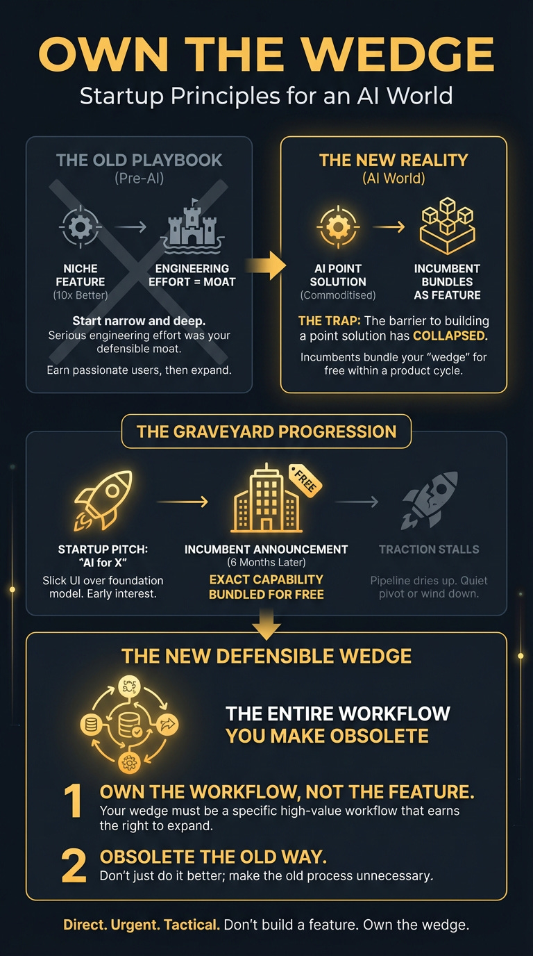 AI commoditised point solutions — founders need a specific high-value wedge that earns the right to expand, rather than building horizontal AI tools that incumbents bundle as features within a product cycle. You were told to start with a tiny niche, a single feature done ten times better. Turns out, that advice is now a trap. The defensible wedge isn’t a feature anymore; it’s the entire workflow you make obsolete.