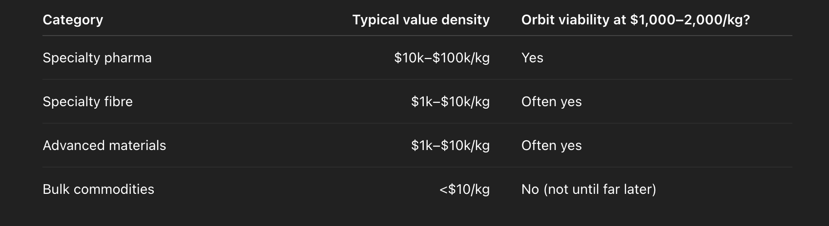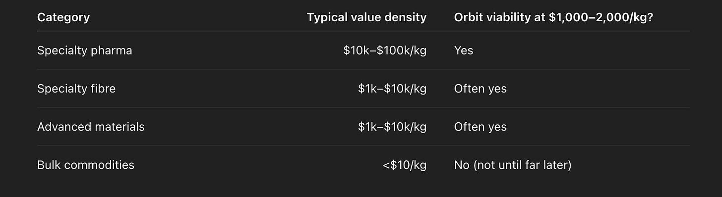 The first trillion-dollar orbital industries will not be “new.” They will be existing industries done better: chips, fibres, crystals, pharmaceuticals. The value-per-kilogram is already high enough. The only missing variable is launch cost.