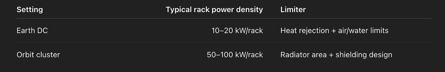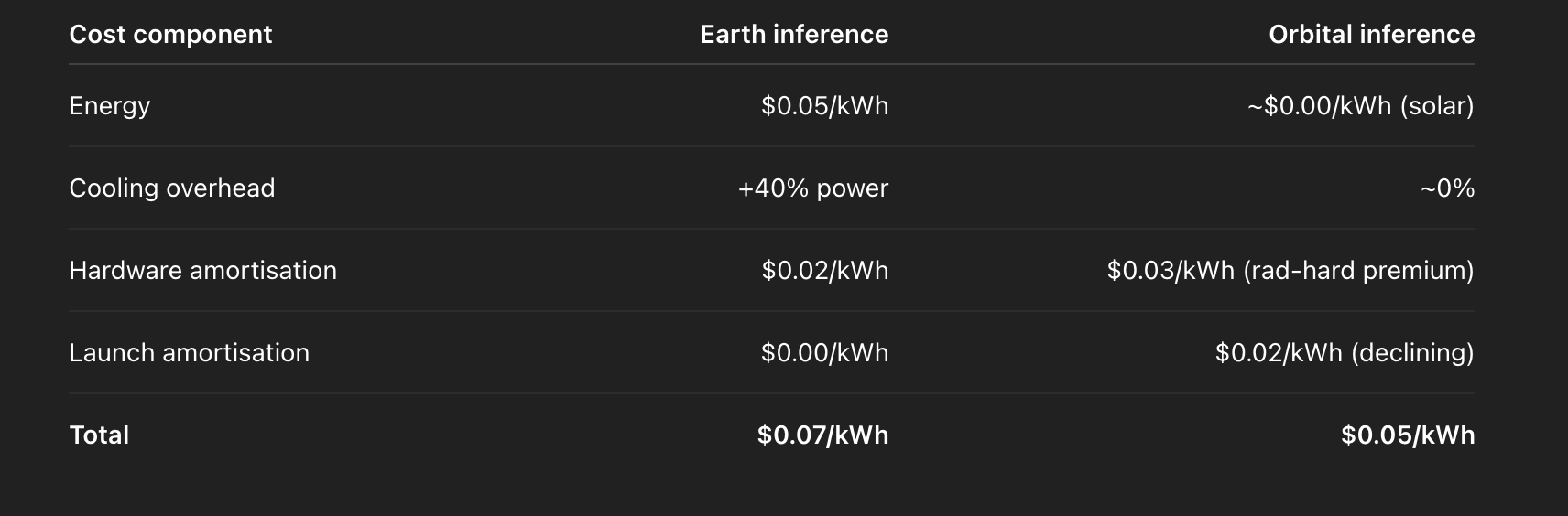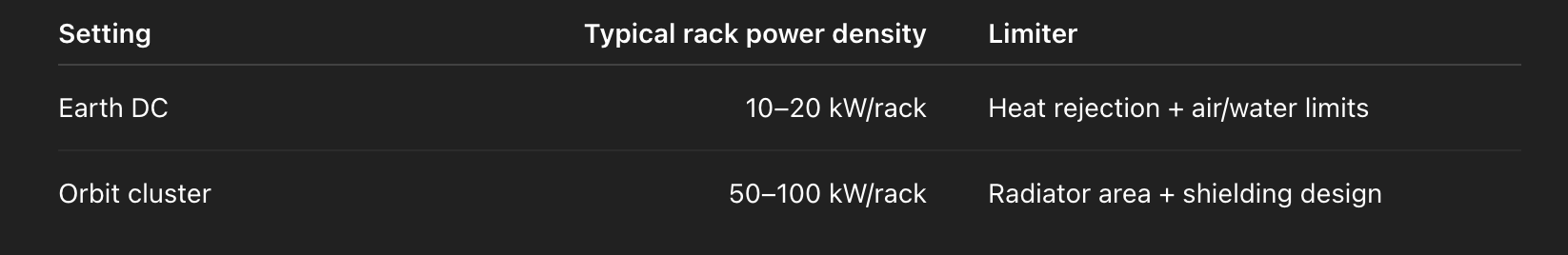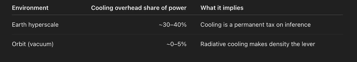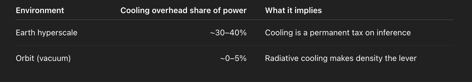 On Earth, cooling consumes 30–40% of the electricity input to large compute clusters. Above the atmosphere, that drops to near 0%.