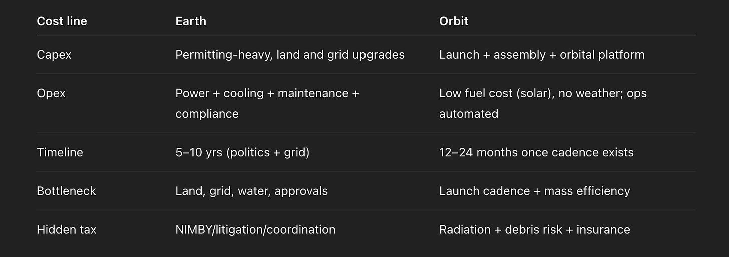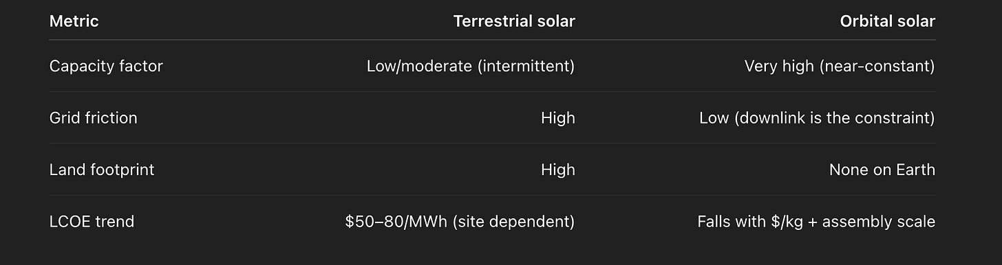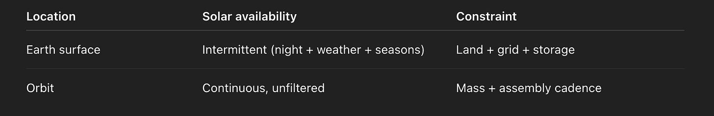 On Earth, adding 10 GW of solar can take a decade. In orbit, it is a deployment problem: launch mass and assembly cadence.