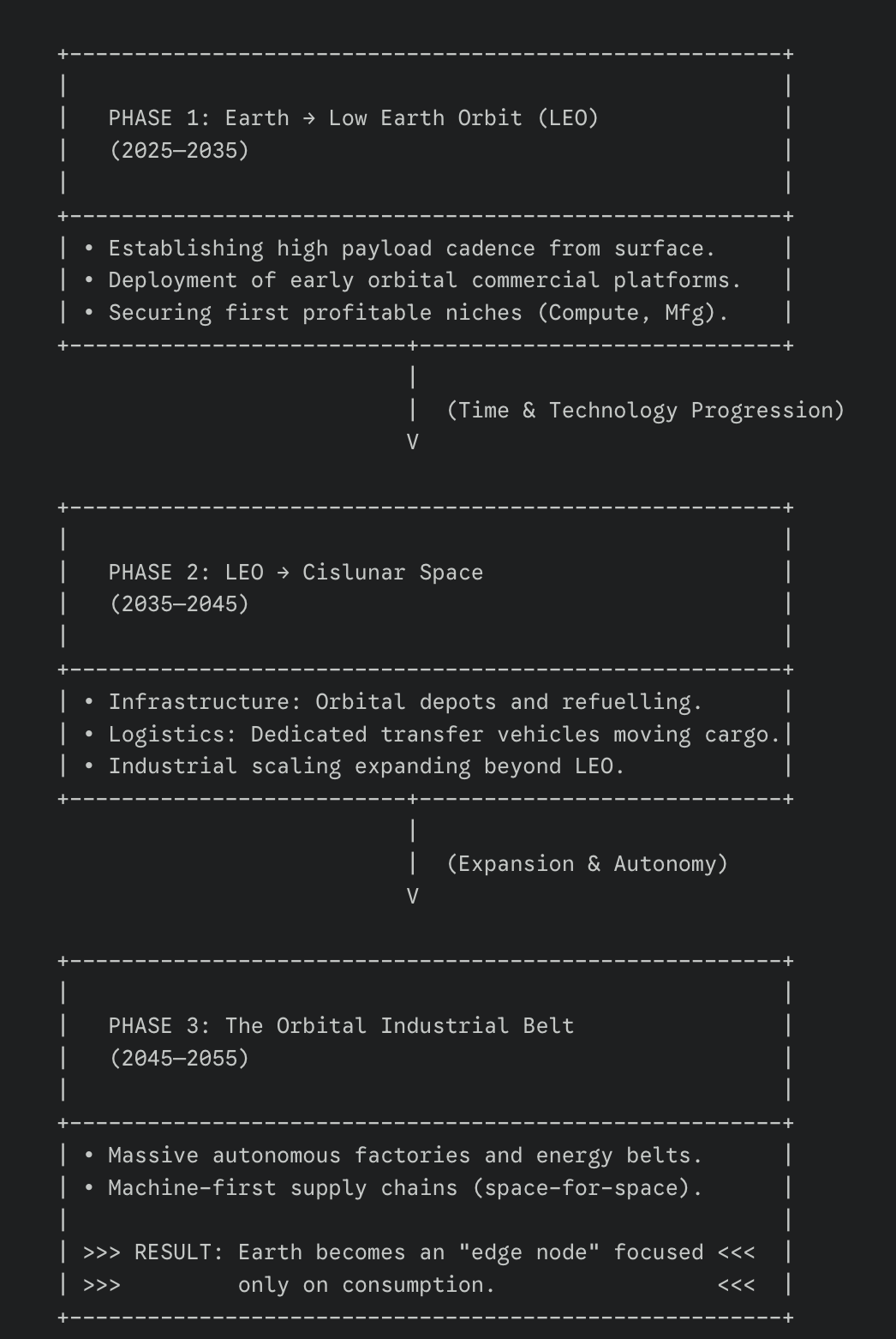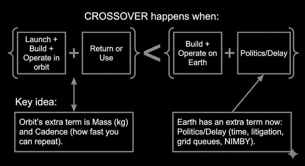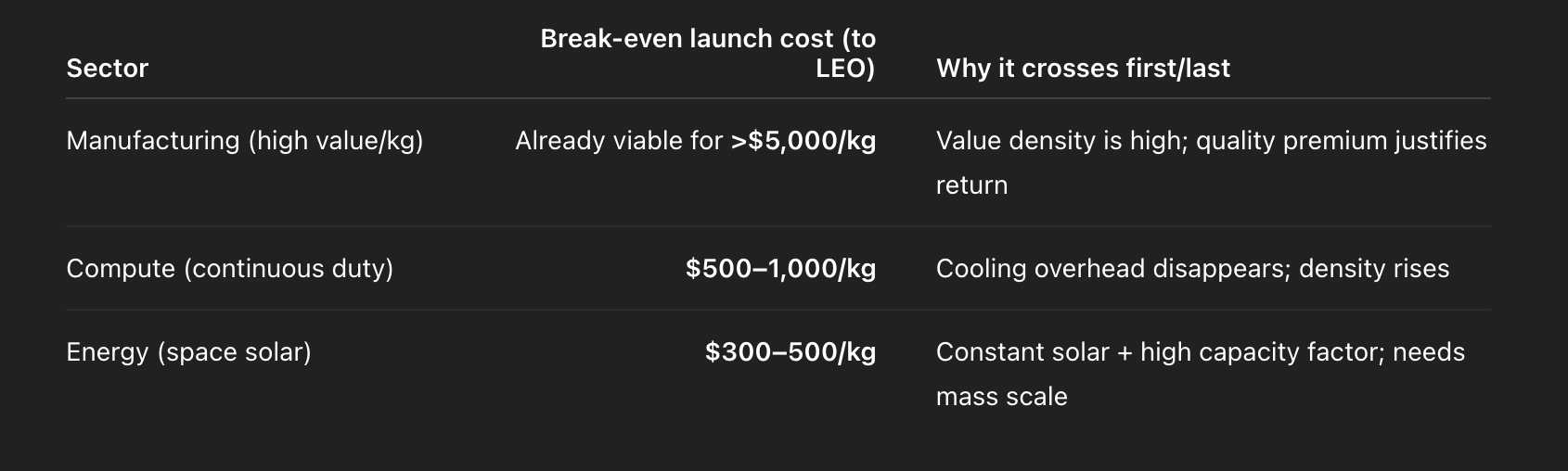 The core claim: vertical industry begins the moment orbital cost < terrestrial cost for energy, compute, or manufacturing.