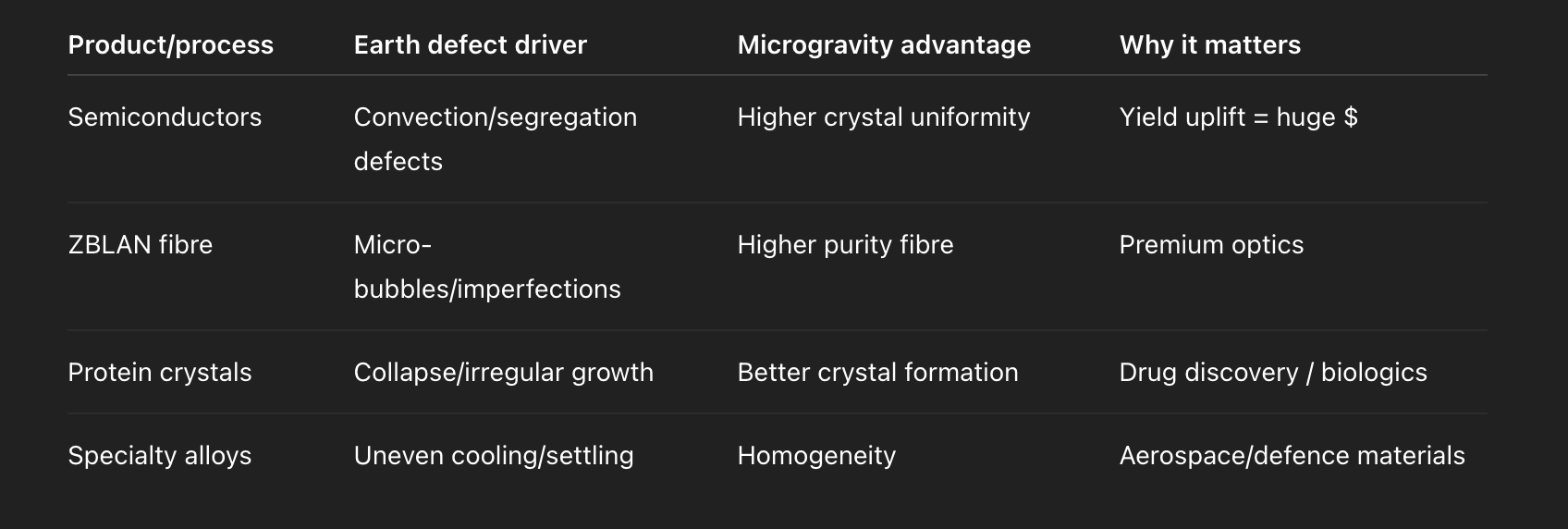 Alloys cool unevenly. Semiconductors suffer defects from convection currents. Biological materials collapse under their own weight. Crystals grow imperfectly. Fibre optics sag microscopically, reducing quality.