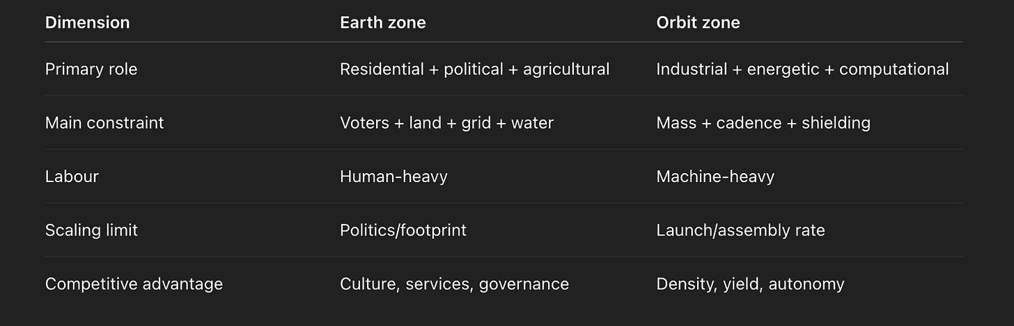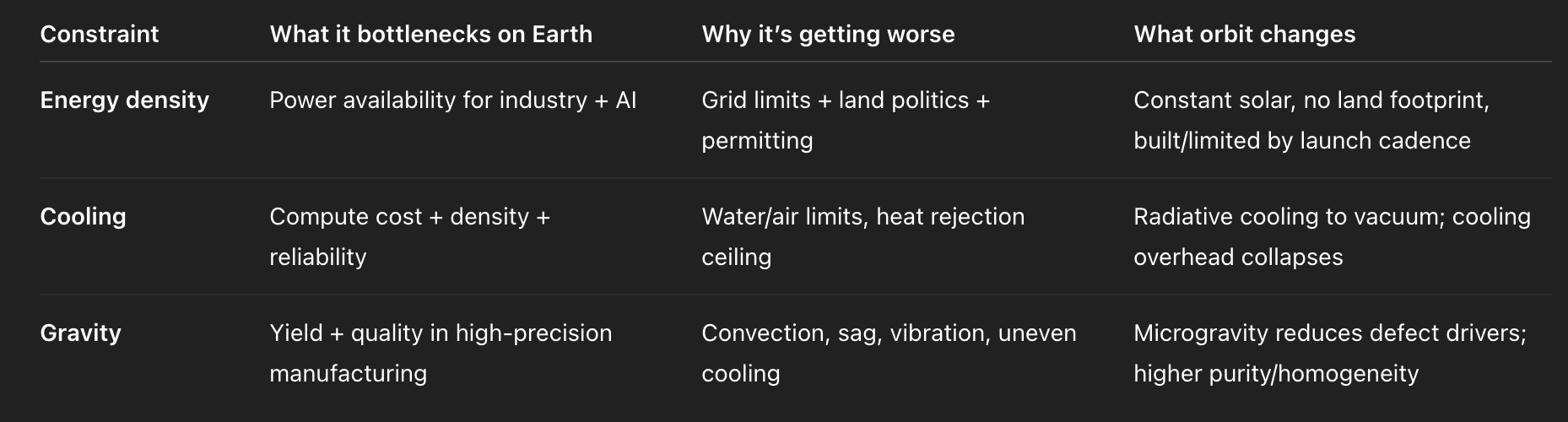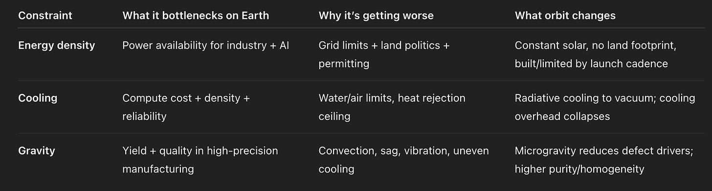 The reason space has re-entered serious economic debate is not Elon Musk, NASA nostalgia or billionaire cosplay. It is because space is the only environment where the three load-bearing constraints of Earth-based industry disappear at the same time.