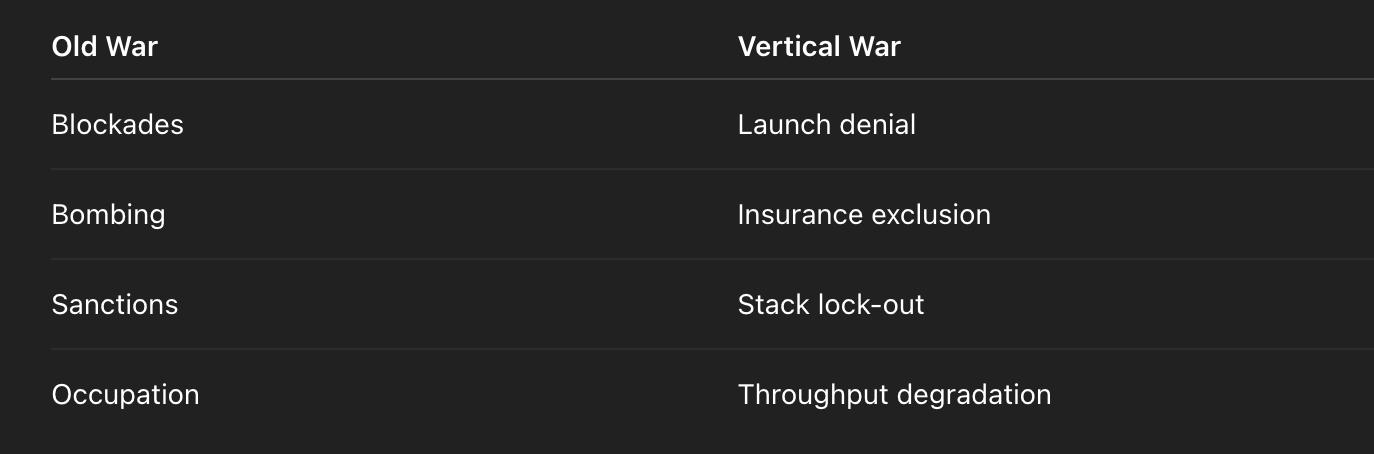 Vertical conflict trends asymmetric: denial, degradation, sabotage, sanctions, standards warfare, insurance warfare. It is less “end of the world”, more “end of your growth model”.