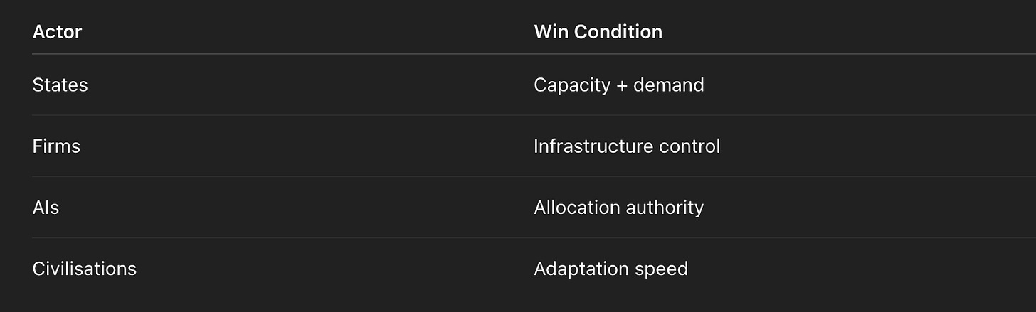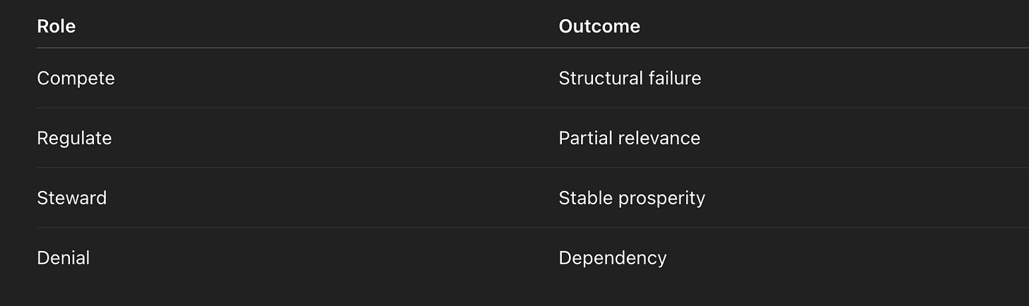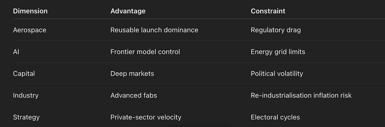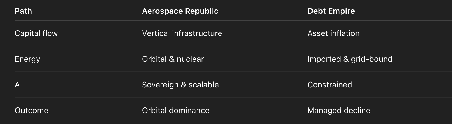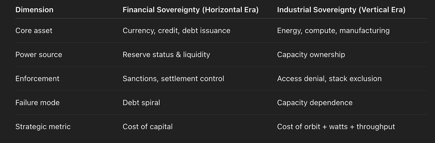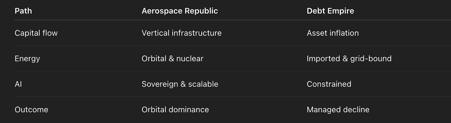 In the debt–productivity era, nations were ranked by their ability to borrow cheaply and maintain the illusion. In the vertical era, nations will be ranked by their ability to build capacity — energy, compute, launch, materials, autonomy — and maintain demand in a world where labour’s share trends toward zero.