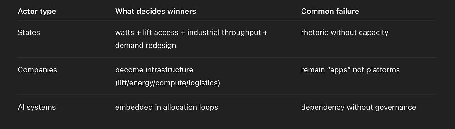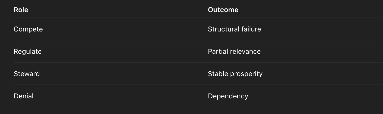 This is the coalition that tries to preserve the old world’s benefits — without the old world’s labour economics. Its risk is the terminal demand problem: if labour’s share collapses and income redesign lags, the compute economy produces intelligence into a shrinking consumer base.