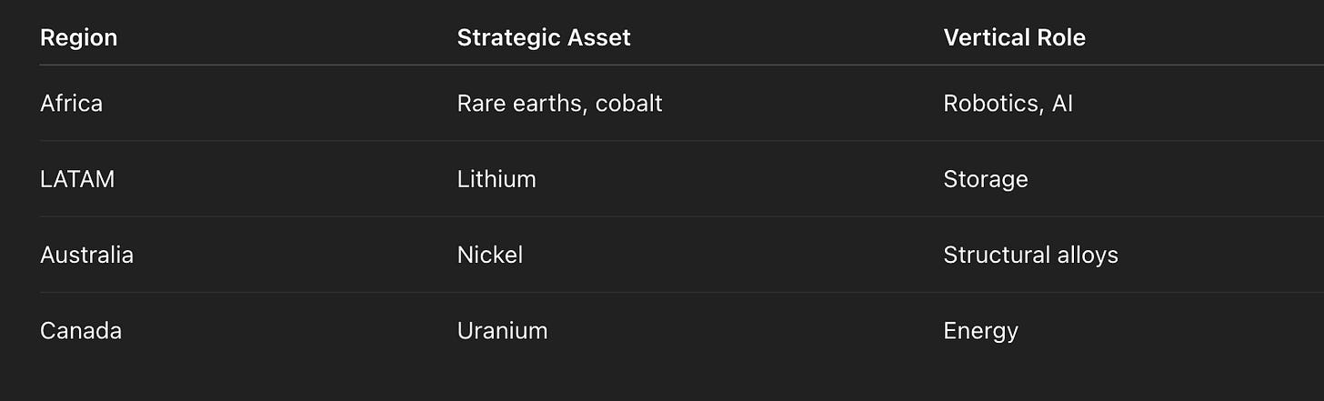 Africa’s centrality returns because vertical industry is materials-intensive. Not optional. Intensive.