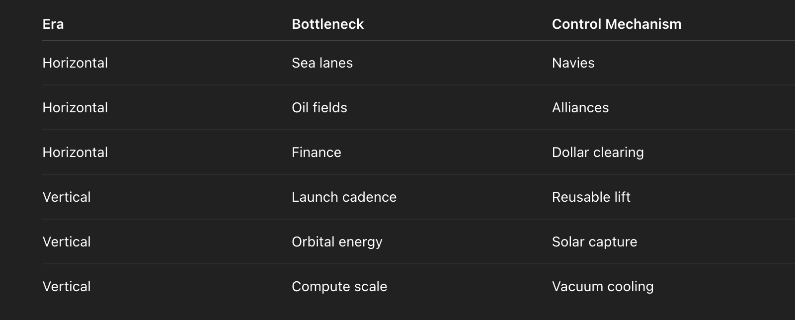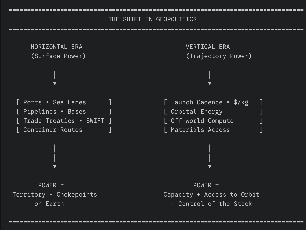 This is the moment power stops being a function of territory and becomes a function of trajectory — who can get mass to orbit cheapest, who controls the energy above the atmosphere, who commands the compute clusters not subject to terrestrial politics, and who builds the first industrial belt where gravity is optional.
