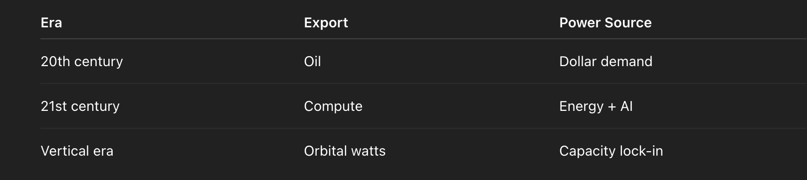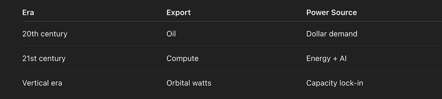 The reserve currency of the vertical age is not a note. It is capacity: guaranteed, scalable watts feeding scalable compute. The Gulf can export that capacity — not only as LNG, but as sovereign compute.
