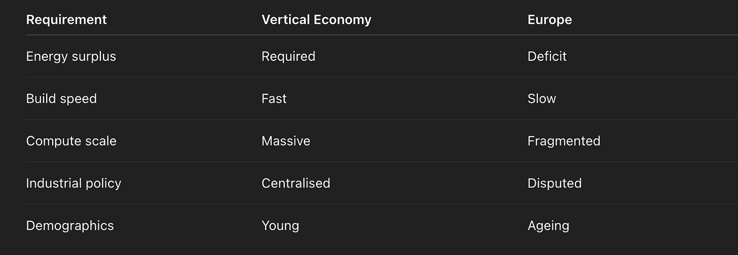 The West treats the Gulf as an energy appendage. The vertical economy treats it as a platform: capital + energy + geopolitical flexibility + a willingness to build infrastructure fast. In a world where compute is the new heavy industry, the Gulf’s core competence — converting resource rent into strategic infrastructure — becomes decisive.