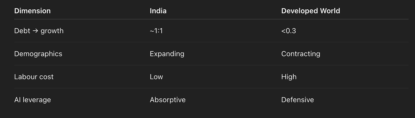 AI compresses capability. It lowers the premium on legacy institutional perfection and raises the premium on scale, adaptation, and absorption. India doesn’t need to copy the West’s twentieth-century model — the one now failing under its own debt weight. It needs to ride the transition: human scale + machine leverage.