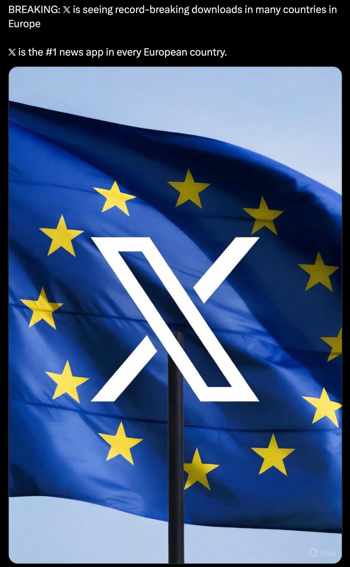 BREAKING: 𝕏 is seeing record-breaking downloads in many countries in Europe 𝕏 is the #1 news app in every European country.