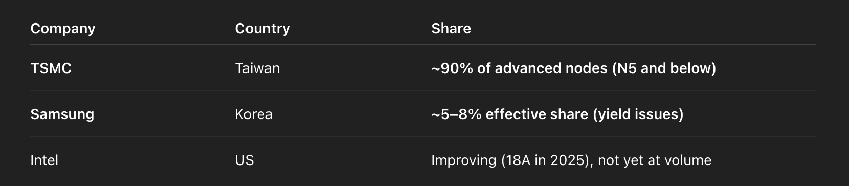 [5] TSMC’s ~90% market share in advanced semiconductor manufacturing (sub-7nm) is a widely cited statistic from market research firms like TrendForce and in reports from geopolitical think tanks like CSIS.