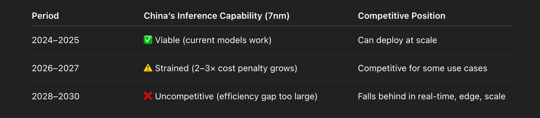 China has a 2–3 year window where 7nm inference is “good enough.” After that, the efficiency gap becomes a strategic handicap.