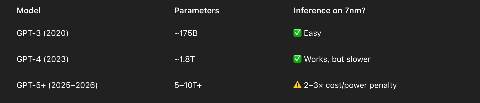 By 2026–2028, the 7nm ceiling will constrain not just innovation (training), but deployment (inference) at competitive cost, latency, and power efficiency.