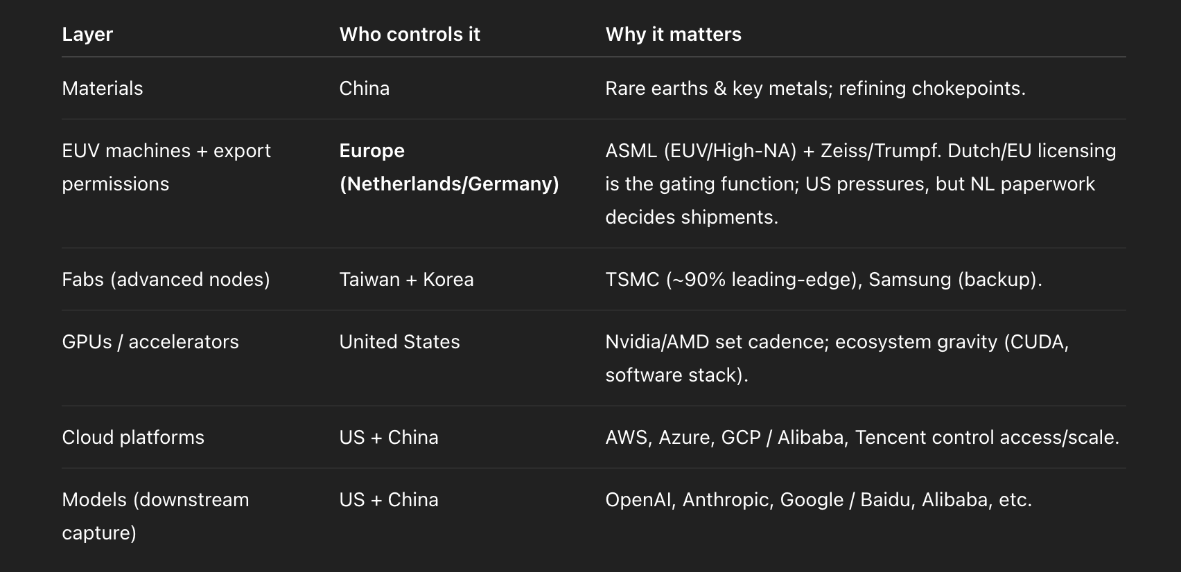 Europe controls the machines. Taiwan controls the fabs. The US controls the cloud and the software ecosystem. China controls the minerals.