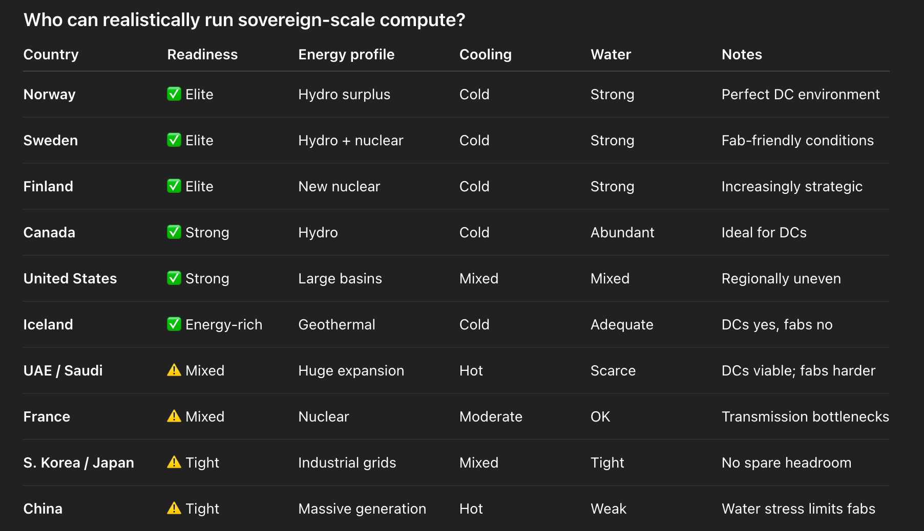 Forget models. Forget GPUs. If you don’t have energy, you don’t have compute. And not just “cheap electricity.” You need a stable grid, modern transmission, ideal cooling conditions, and secure water rights. Most countries fail the test before they’ve even begun.
