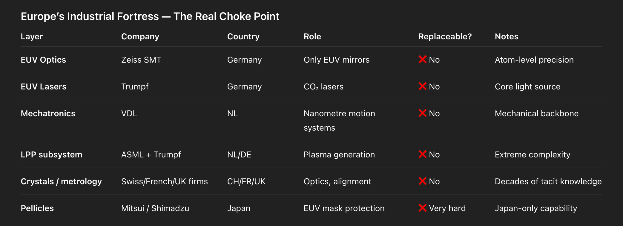 This ecosystem is locked through joint IP, co-development, exclusive agreements, and decades of tacit knowledge. There is no second source for any of it. If even one of these firms stops? The global AI industry stalls at the Dutch–German border. This is the part Silicon Valley never talks about.