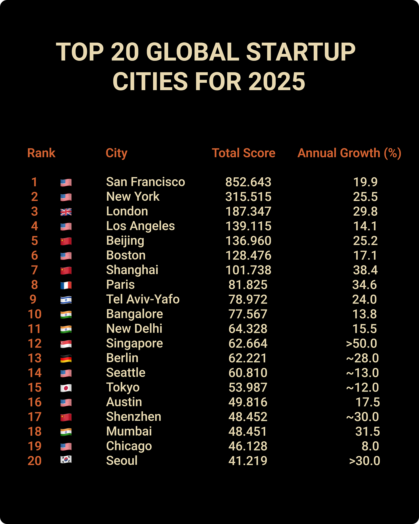 🌍 Top 20 Global Startup Cities 2025 — Who’s Leading, Who’s Rising