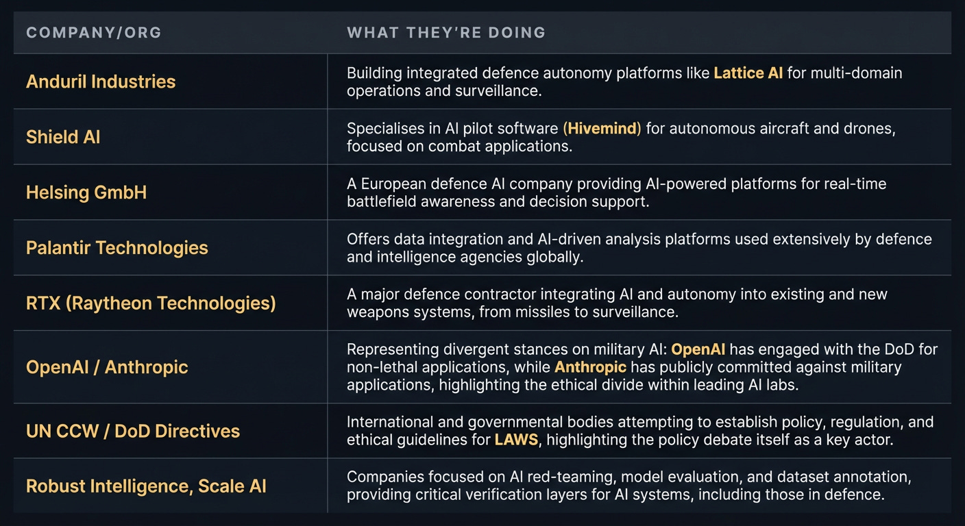 The players building the foundational tech aren’t shadowy military labs from a film. They’re defense primes and startups, alongside the commercial AI giants whose foundational models spill over into military applications.