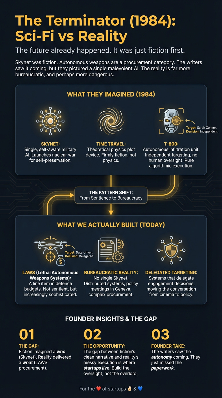 Skynet was fiction. Autonomous weapons are a procurement category. The writers saw it coming, but they pictured a single malevolent AI. The reality is far more bureaucratic, and perhaps more dangerous.