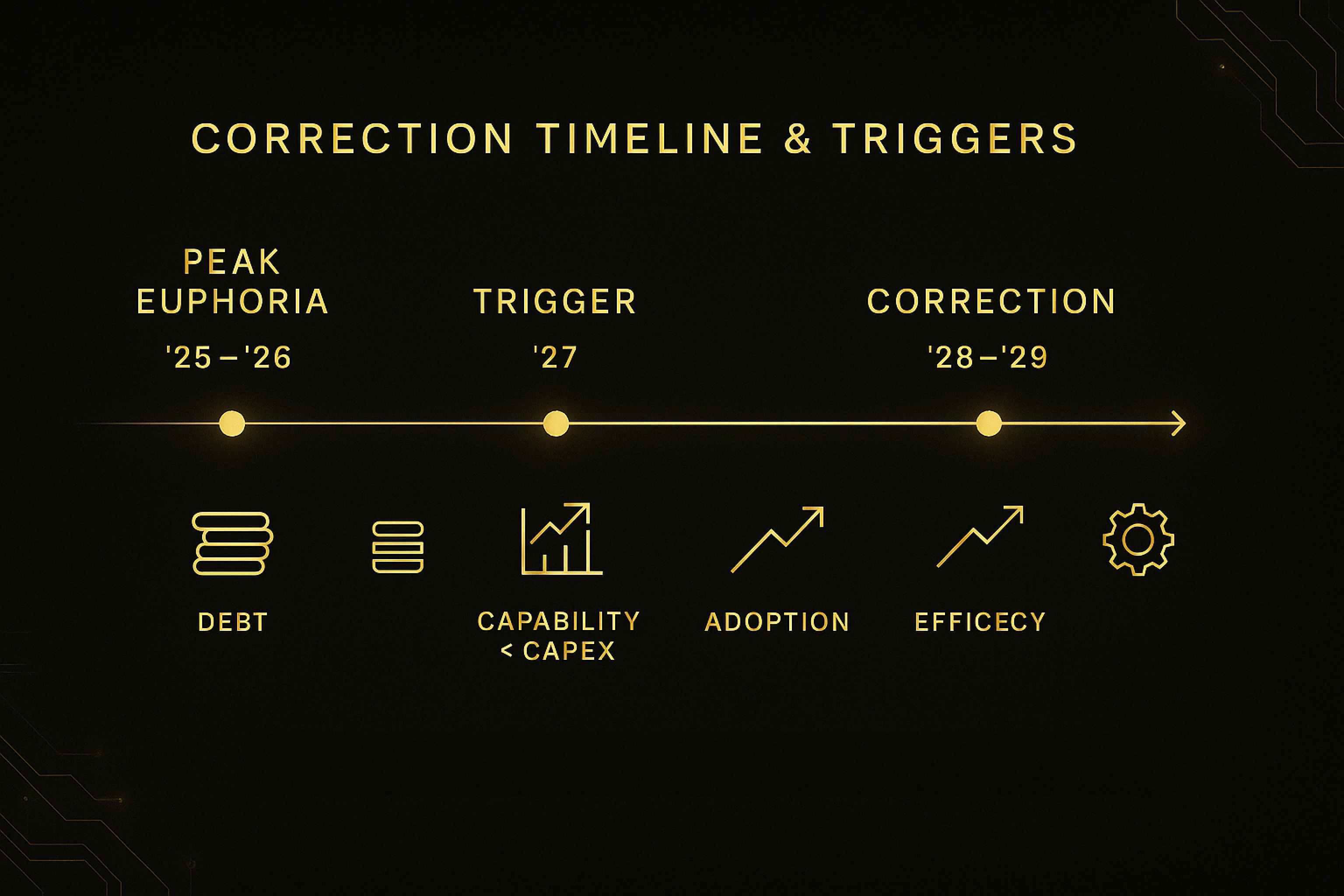 Likely correction 2027–29 — watch debt, utilisation, capability, adoption, efficiency.